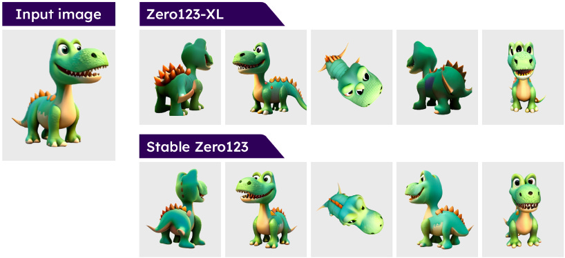 Stable Zero123 generates novel views of an object, demonstrating 3D understanding of the object’s appearance from various angles– all from a single image input. It’s notably improved quality over Zero1-to-3 or Zero123-XL is due to improved training datasets and elevation conditioning.