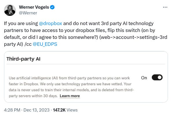 🚫Amazon CTO shares how to opt out of 3rd party AI partner access to your Dropbox. Check out the tweet here (Link)