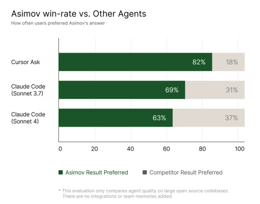 Its standout feature, âAsimov Memories,â helps teams update knowledge using natural language prompts, all backed by role-based access controls. With multiple retriever agents feeding a central reasoning engine, Asimov beat Claude Code in blind tests with 82% developer preference.