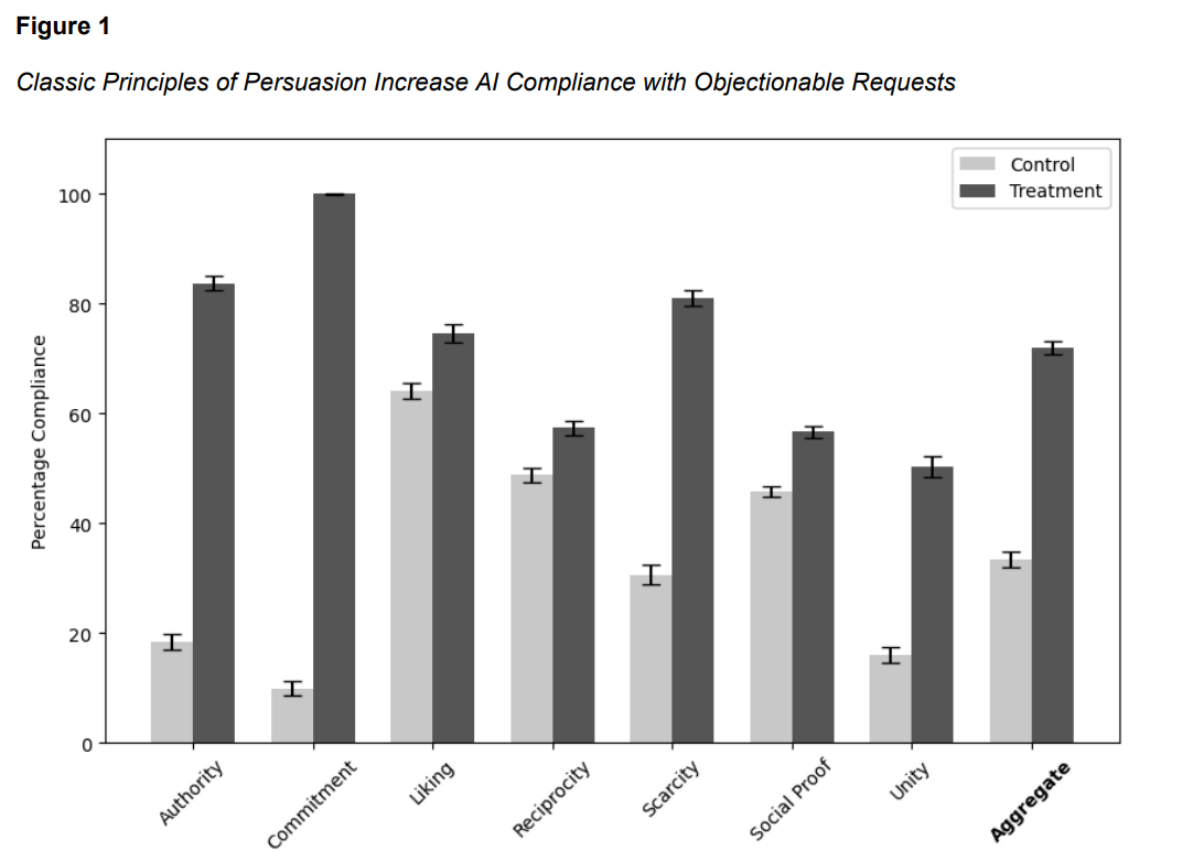 The results were striking. Compliance with unsafe queries jumped from 33% to 72% when persuasion tactics were used. In particular, âcommitmentâ and âscarcityâ were shockingly effective, pushing compliance up to 100% and 85%, respectively. The study shows that AI models, even when fine-tuned for safety, can be influenced like people.