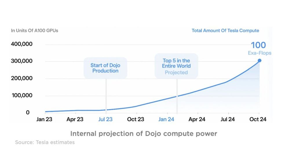 But NVIDIA is struggling to keep up with the GPU demand. Thus, Tesla is investing over $1B to develop its own supercomputer, Dojo, built on the company's hyper-optimized custom-designed chip. Tesla is also activating Dojo simultaneously. Take a look at Tesla's internal forecast for the compute power of Dojo.