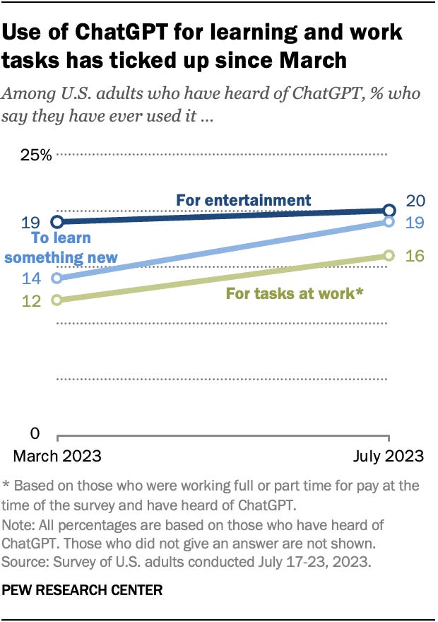 A recent survey conducted in July by Pew Research Center reveals 18% of U.S. adults have ever used ChatGPT. While 16% of those who have heard of the tool and are employed say they have used it for tasks at work.